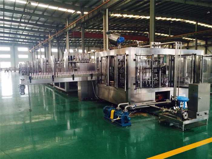 瓶子通過空瓶輸送系統(tǒng)進(jìn)入灌裝機(jī)分瓶撥輪,裝在撥輪上的瓶夾將分隔開一定間距的瓶連續(xù)不斷地送入三合一機(jī)的沖瓶機(jī)。沖瓶機(jī)回轉(zhuǎn)盤上裝有卡瓶口式不銹鋼瓶夾,瓶夾夾住瓶口沿導(dǎo)軌翻轉(zhuǎn)180°,使瓶口向下。在沖瓶機(jī)特定區(qū)域,瓶夾上的噴嘴先噴消毒水再噴無菌水(如無要求只有一次沖瓶),對瓶子內(nèi)壁進(jìn)行消毒、沖洗。瓶子經(jīng)消毒、沖洗、瀝干后在瓶夾夾持下沿導(dǎo)軌再翻轉(zhuǎn)180°,使瓶口向上。裝在撥輪上的扳扭夾把經(jīng)沖洗后的瓶子從沖瓶機(jī)拿出并送入灌裝機(jī)。進(jìn)入灌裝機(jī)的瓶子由瓶升降機(jī)構(gòu)上的夾子卡住瓶口保持,在瓶升降機(jī)構(gòu)和凸輪的作用下實現(xiàn)上升與下降。瓶升降機(jī)構(gòu)上升使瓶口接觸、頂開灌裝閥后完成灌裝過程。灌裝結(jié)束后瓶升降機(jī)構(gòu)在凸輪的作用下下降,下降到較低位后,由過渡撥輪上的扳扭夾把灌裝完成的瓶子從灌裝機(jī)拿出并送入旋蓋機(jī)。旋蓋機(jī)上的止旋刀卡住瓶頸部位,保持瓶子直立并防止旋轉(zhuǎn)。旋蓋頭在旋蓋機(jī)上保持公轉(zhuǎn)并自轉(zhuǎn),在凸輪作用下實現(xiàn)抓蓋、套蓋、旋蓋、脫蓋動作,完成整個封蓋過程。成品瓶通過出瓶撥輪從旋蓋機(jī)傳送到出瓶輸送鏈上,由輸送鏈傳送出三合一機(jī)。