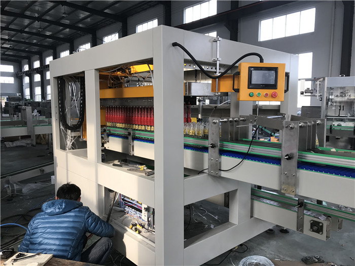 本機是一種智能性全自動裝箱機,采用高速分配裝置包裝各種容器,包裝塑料扁瓶、圓瓶、不規則形瓶,各種大小玻璃瓶,圓瓶、橢圓形瓶、方形罐及紙罐等,另外也適用于帶隔板的包裝箱。由瓶夾(內置橡膠,以防損傷瓶體)夾住瓶體,放入打開的紙箱當中,當抓頭抬起時,將紙箱排出,送至封箱機,本機采用P.L.C +觸摸顯示屏控制。設有缺瓶報警停機,無瓶不裝箱安全裝置。大大減少生產人員和勞動強度,是自動化規模生產必不可缺少的設備。