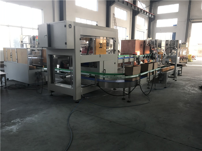 本機(jī)是一種智能性全自動(dòng)裝箱機(jī),采用高速分配裝置包裝各種容器,包裝塑料扁瓶、圓瓶、不規(guī)則形瓶,各種大小玻璃瓶,圓瓶、橢圓形瓶、方形罐及紙罐等,另外也適用于帶隔板的包裝箱。由瓶夾(內(nèi)置橡膠,以防損傷瓶體)夾住瓶體,放入打開(kāi)的紙箱當(dāng)中,當(dāng)抓頭抬起時(shí),將紙箱排出,送至封箱機(jī),本機(jī)采用P.L.C +觸摸顯示屏控制。設(shè)有缺瓶報(bào)警停機(jī),無(wú)瓶不裝箱安全裝置。大大減少生產(chǎn)人員和勞動(dòng)強(qiáng)度,是自動(dòng)化規(guī)模生產(chǎn)必不可缺少的設(shè)備。