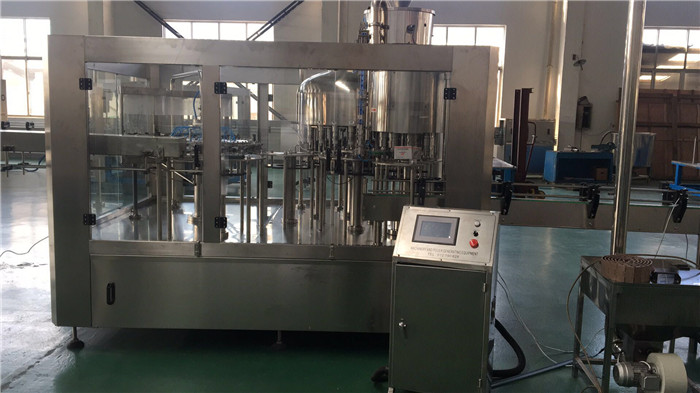 瓶子通過空瓶輸送系統進入灌裝機分瓶撥輪,裝在撥輪上的瓶夾將分隔開一定間距的瓶連續不斷地送入三合一機的沖瓶機。沖瓶機回轉盤上裝有卡瓶口式不銹鋼瓶夾,瓶夾夾住瓶口沿導軌翻轉180°,使瓶口向下。在沖瓶機特定區域,瓶夾上的噴嘴先噴消毒水再噴無菌水(如無要求只有一次沖瓶),對瓶子內壁進行消毒、沖洗。瓶子經消毒、沖洗、瀝干后在瓶夾夾持下沿導軌再翻轉180°,使瓶口向上。裝在撥輪上的扳扭夾把經沖洗后的瓶子從沖瓶機拿出并送入灌裝機。進入灌裝機的瓶子由瓶升降機構上的夾子卡住瓶口保持,在瓶升降機構和凸輪的作用下實現上升與下降。瓶升降機構上升使瓶口接觸、頂開灌裝閥后完成灌裝過程。灌裝結束后瓶升降機構在凸輪的作用下下降,下降到較低位后,由過渡撥輪上的扳扭夾把灌裝完成的瓶子從灌裝機拿出并送入旋蓋機。旋蓋機上的止旋刀卡住瓶頸部位,保持瓶子直立并防止旋轉。旋蓋頭在旋蓋機上保持公轉并自轉,在凸輪作用下實現抓蓋、套蓋、旋蓋、脫蓋動作,完成整個封蓋過程。成品瓶通過出瓶撥輪從旋蓋機傳送到出瓶輸送鏈上,由輸送鏈傳送出三合一機。